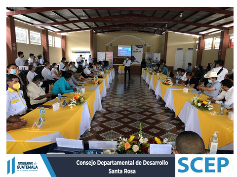 Décima reunión ordinaria de Consejo Departamental de Desarrollo de Santa Rosa, celebrada en el salón municipal frente al nuevo parque San Juan Tecuaco, Santa Rosa. Contando con la presencia del Presidente Coordinador del CODEDE, Vice Ministro de Energía y Minas, Alcaldes Municipales, Delegados/Coordinadores de Instituciones, Invitados Especiales y Sociedad Civil, para tratar los puntos de agenda: 1- Política para enfrentar violencia contra la mujer en el departamento de Santa Rosa; 2- Situación Epidemióloga COVID-19 del departamento y desnutrición aguda; 3- Consulta a pueblos indígenas, Minera El Escobar; 4-Avances físicos y financieros ejercicio fiscal 2021 y ranking municipal; y 5- Certificación de la acreditación de la CONRED.